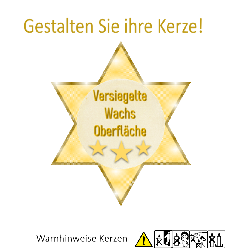 Der Druck wird auf die Kerze oder auf die Folie aufgebracht und ist daher genauso vorsichtig zu handhaben wie eine Kerze mit Echtwachs.Abrieb durch feste Gegenstände, wie zum Beispiel Fingernägel oder Ringe beim Anfassen oder Tragen der Kerze sind normale Verschleißerscheinungen.