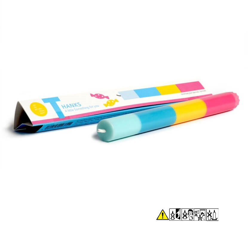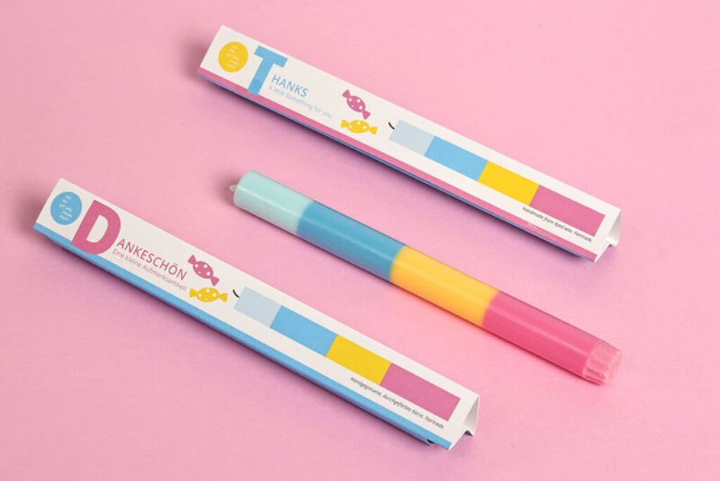 Minimalisitisch und in brillanten Farben haben wir in unseren Kerzen Farbcodes umgesetzt, die sich auf unterschiedliche Lebensaspekte beziehen. Jede Kerze wird so zur Botschaft und zum Geschenk, das Glückwünsche und Grüße übermittelt. Bei uns findet jedes Thema seine Kerze und jede Kerze ein neues Thema. Die Kerzen werden aus durchgefärbtem, pflanzlichen Wachs handgefertigt. Die Verpackungen, die in Hamburg klimaneutral auf FSC-zertifiziertem Designpapier gedruckt und weiterverarbeitet werden, sind zweisprachig: eine Seite auf Deutsch, die andere auf Englisch.