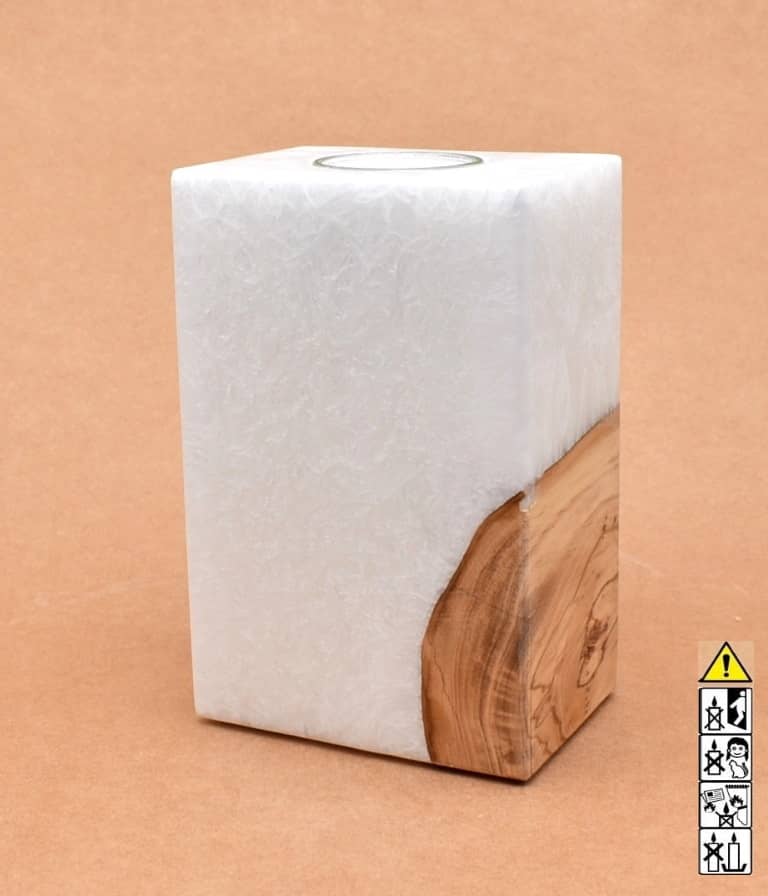 Es dürfen bei den Kerzen mit Holzelement nur Teelichter aus Paraffin mit Aluminium Hüllen max. Ø=38mm, Höhe=17mm und 6h Brenndauer verwendet werden, da sonst die Hitze für den Korpus zu groß wird. Bei Teelichter in Kunststoffhülle, oder Teelichter ohne Alu-Hülle, bei farbigen Teelichter und bei Teelichter aus Bienenwachs oder Palmöl kann der Korpus beschädigt werden.