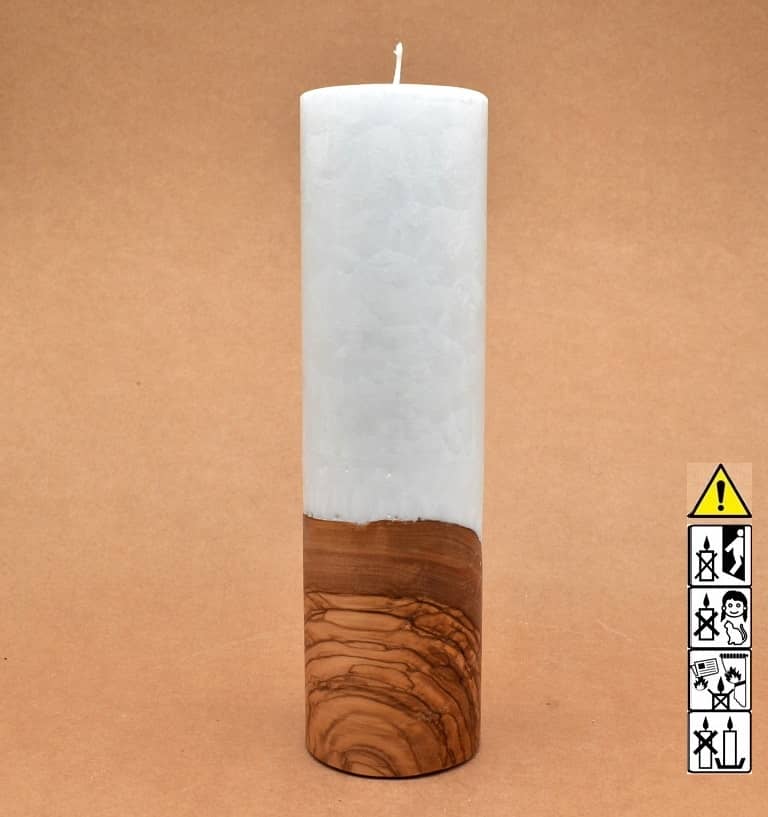 Runde Kerze in Stearinoptik 70 x 250 mm mit Holz und mit Dochteinsatz.