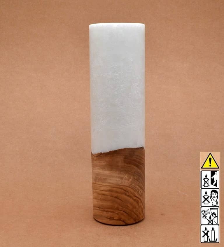 Runde Kerze in Stearinoptik 70 x 250 mm mit Holz und mit Teelichteinsatz.