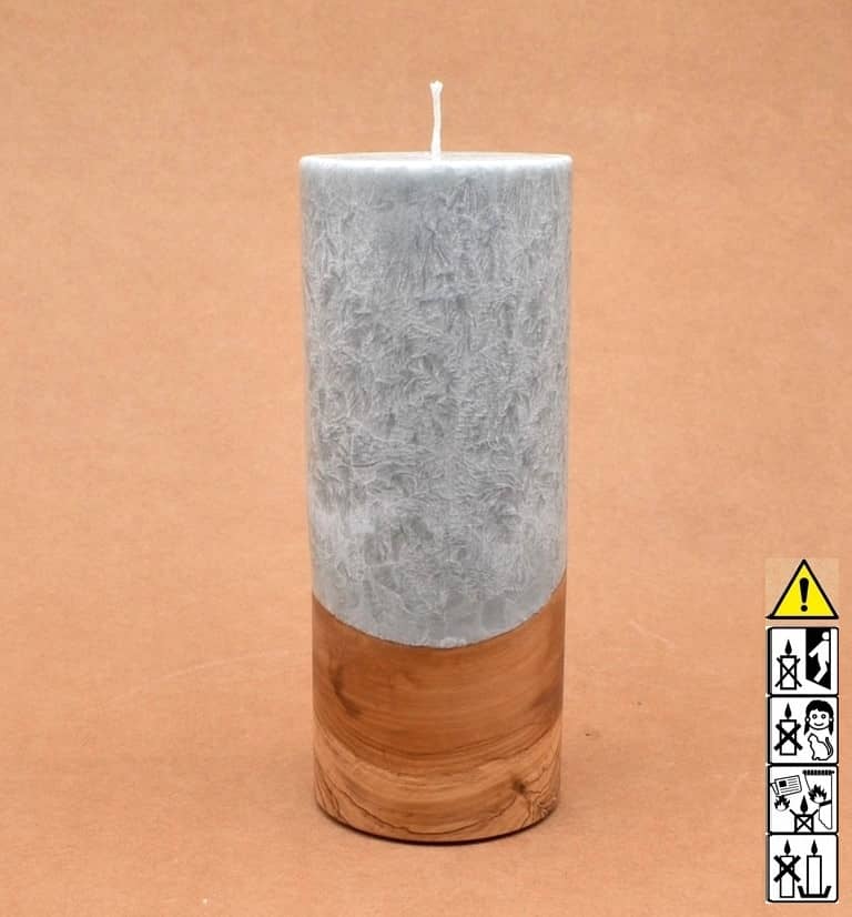 Kerze mit Holz Unikat Rund 80 x 200 mm mit Docht in silbergrau Nr.: 2