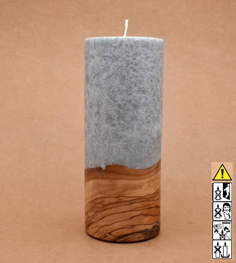 Kerze mit Holz Unikat Rund 80 x 200 mm mit Docht in silbergrau Nr.: 3