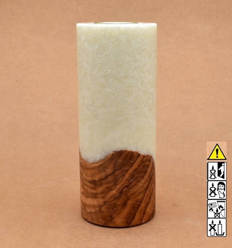 Kerze mit Holz Unikat Rund 80 x 200 mm mit Teelicht in elfenbein Nr.: 6