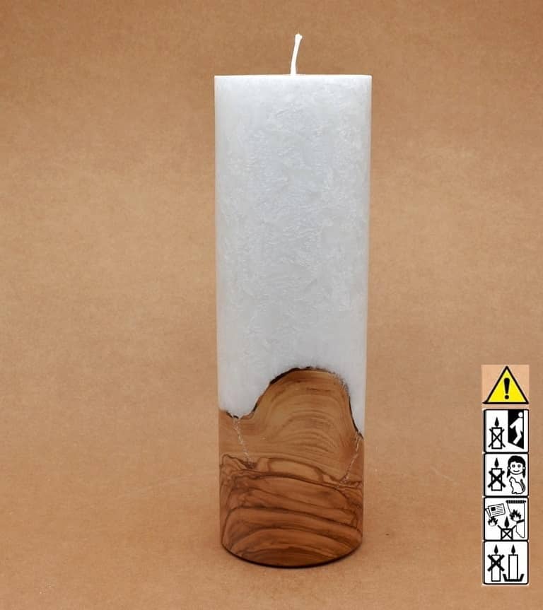 Runde Kerze in Stearinoptik 80 x 250 mm mit Holz und mit Dochteinsatz.