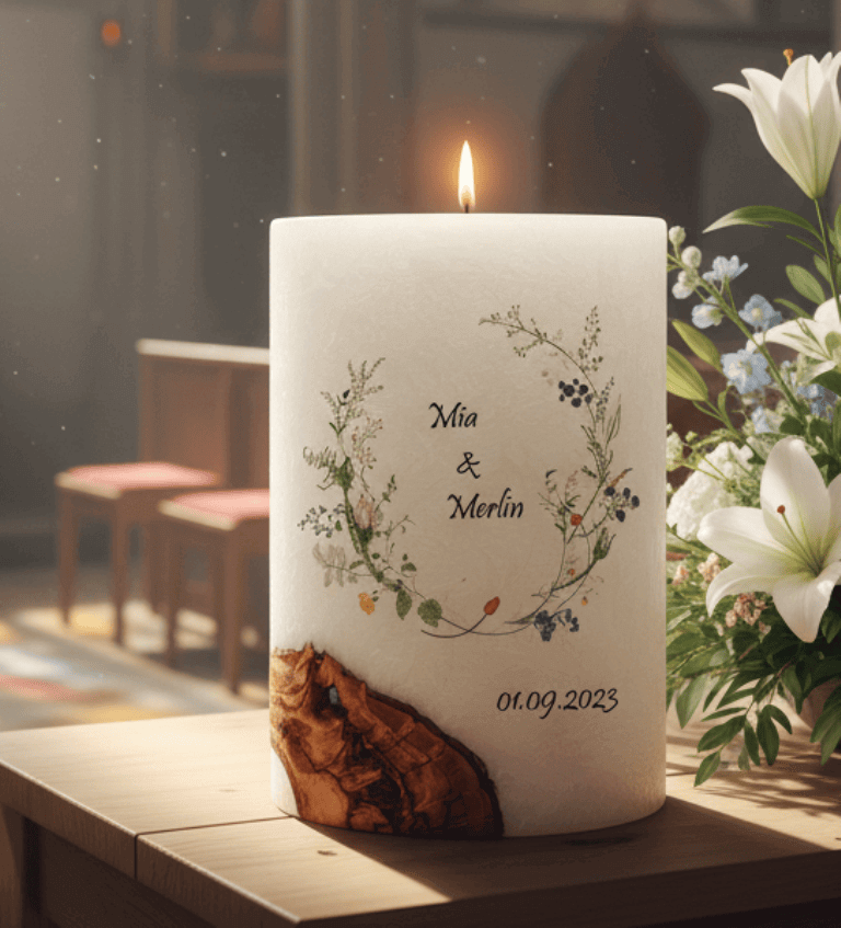 Durch das Personalisieren Ihrer Hochzeitskerze entsteht eine einmalige Optik, welches die Kerze für Sie zu einem Erinnerungsstück und Wegbegleiter macht.