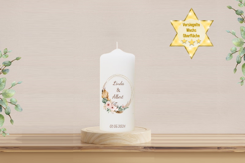 Personalisierte Hochzeitskerze "Blumenkranz" 20 cmUnsere runde Hochzeitskerze als Spitzkopfkerze kann von 7 - 10 cm im Durchmesser frei gewählt werden. Durch das personalisieren der Hochzeitskerze wird eine einmalige Optik erstellt, welche Ihre Kerze für Sie zu einem Unikat macht.Liebevolle Handarbeit für ein Kunstwerk aus Wachs.Jede Kerze wird von Hand mit hochwertigen LED Druck Transferverfahren und/oder direktem UV - Druck hergestellt und bearbeitet.Sie erhalten vor der Anfertigung einen Entwurf (Bild) mit der Originalkerze zur Freigabe.1 x Korrektur ist kostenfrei.Die Verzierungen sind oberflächenversiegelt und können daher auch normal angefasst werden.Die Versiegelung wird durch Handarbeit aufgebracht und hat in sich eine eigene Struktur.Diese Abbildung ist nur ein Beispielbild.Dekomaterial ist nicht Bestandteil der Bestellung. Die Bilder sind keine Originalbilder der Kerze.Hersteller-Artikel-Nr.: RUGHZW072020